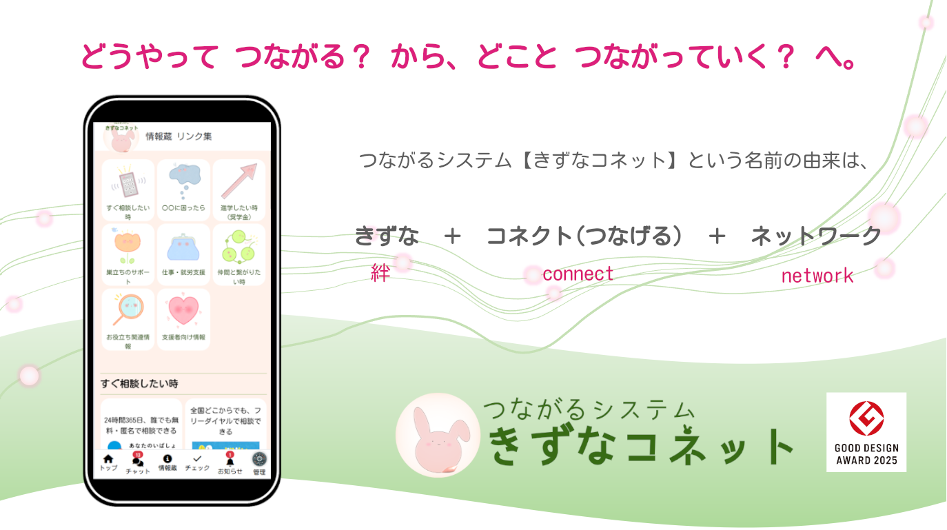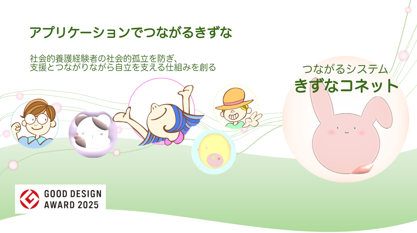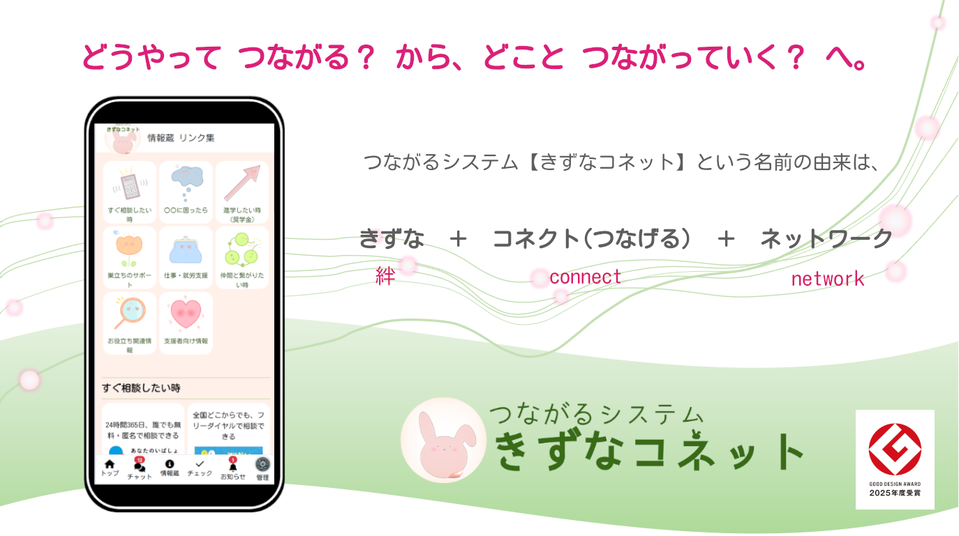 新着情報News 2025年度グッドデザイン賞受賞展に展示します2025年10月20日 2025年度グッドデザイン賞を受賞しました2025年10月17日 【2025年11月1日】第3回公開セミナーin福島「一緒に学ぼう!考えよう!ケアリーバー(社会的養護経験者)の自立を支える仕組みについて」を開催します2025年10月6日 JSTnews10月号「イノベ見て歩き」に掲載していただきました2025年10月3日 「第2回 きずなコネット広域ネットワーク検討委員会」を行いました2025年9月10日 【2025年10月1日発行予定】JSTnews10月号に掲載されます2025年7月31日 「第1回 きずなコネット広域ネットワーク検討委員会」を行いました2025年7月25日 NHK津放送局「まるっと!みえ」に出演させていただきました2025年6月19日 FM軽井沢「軽井沢ラジオ大学」に出演させていただきました2025年5月14日 【重要】メンテナンスのお知らせ2025年4月21日