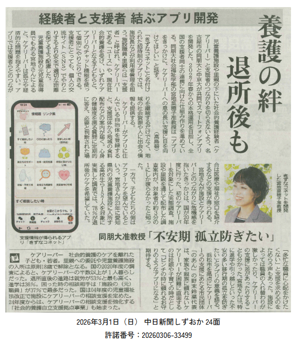 このたび本プロジェクトで開発中のアプリ・システム「きずなコネット」についての記事が、「中日新聞しずおか(2026年3月1日)」に掲載されました。