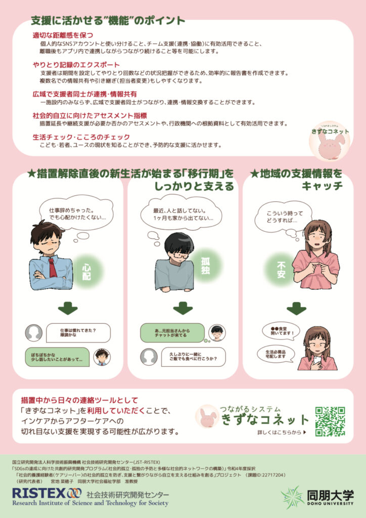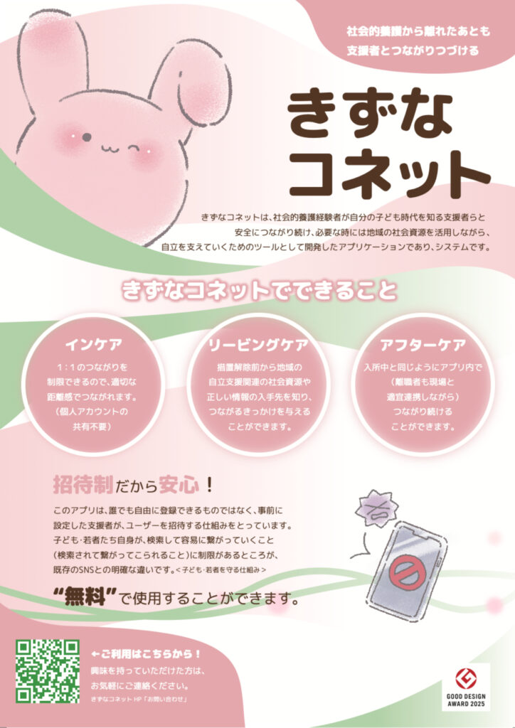 社会的養護経験者と支援者が安全につながり、連絡調整できるためのツールとして、本プロジェクトで開発したモバイルメッセンジャーアプリケーション(アプリ)であり、つながるシステムです。