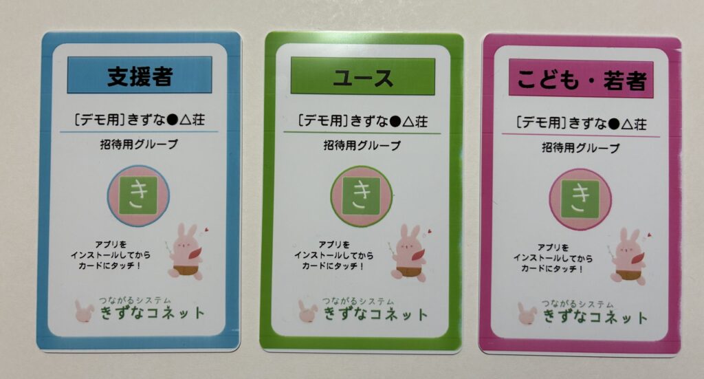 きずなコネットでは、クレジットカードサイズのNFCタグを使用しています。きずなコネットに新規登録したい方にスマホでこのカードをタッチしてもらうとスマホ内で招待状が発行され、ユーザー登録ができるようになります。