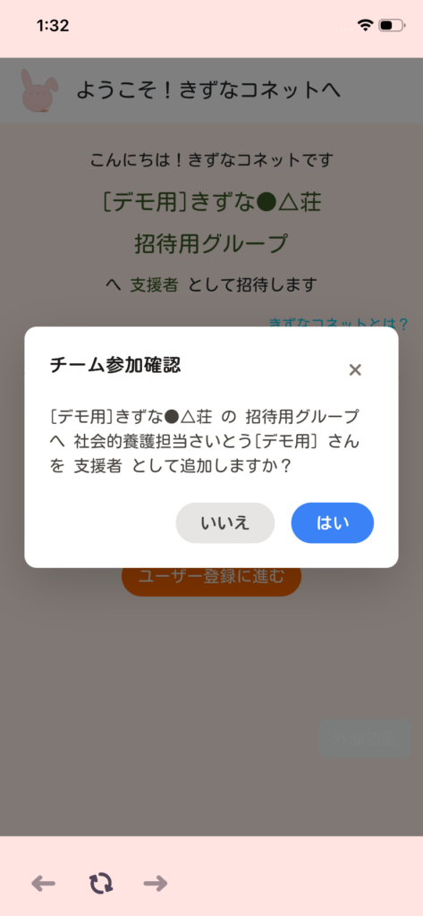 - チーム参加確認のメッセージが表示されるので、「はい」をタップします